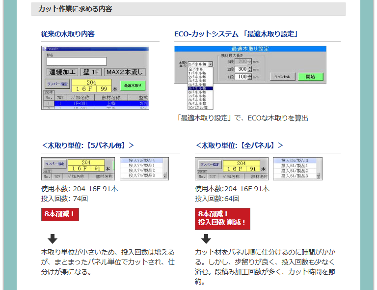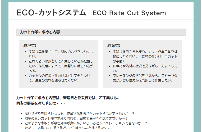 - 歩留りを考えるあまり、カット作業自体を煩雑にしたくない。(端材の仕分け、再カットの手間)